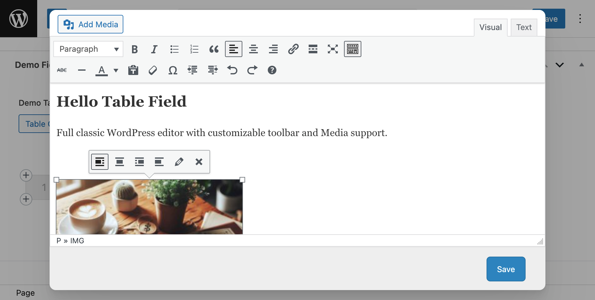 Clicking on a table cell enables inline text editing or a classic WordPress editor according to the settings.